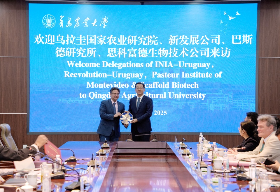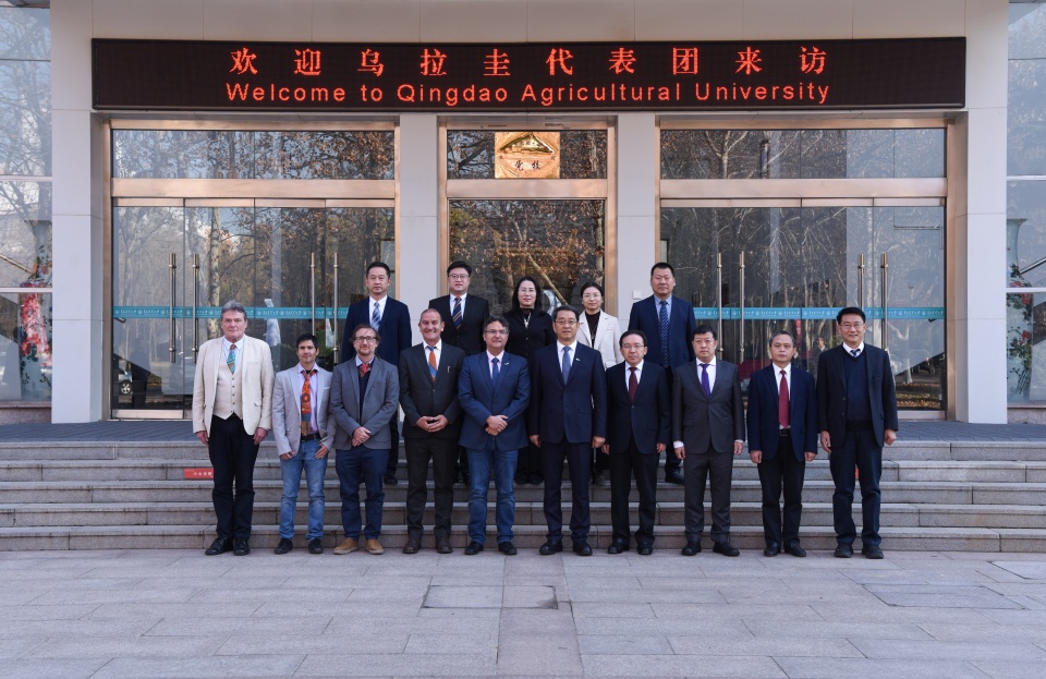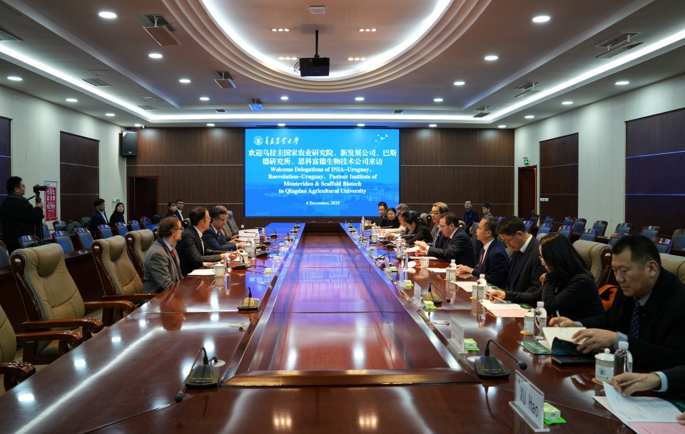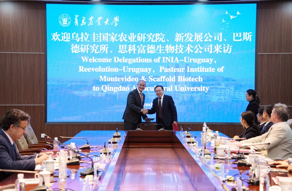 赵金山在致辞中代表学校对乌拉圭代表团一行的到来表示了欢迎,回顾了11月访问蒙得维的亚期间的友好经历,对乌拉圭各界的热情接待表示了感谢。随后,赵金山详细介绍了山东省与青岛市的经济文化发展概况,并重点阐述了学校在畜牧养殖、草业科学、动物医学等领域的学科优势与科研进展。他指出,青岛农业大学与乌拉圭多家机构已于上月签署了三份合作备忘录,为双方在草地农业领域的合作奠定了坚实基础,此次访问将继续推动双方的合作走向深入。