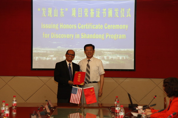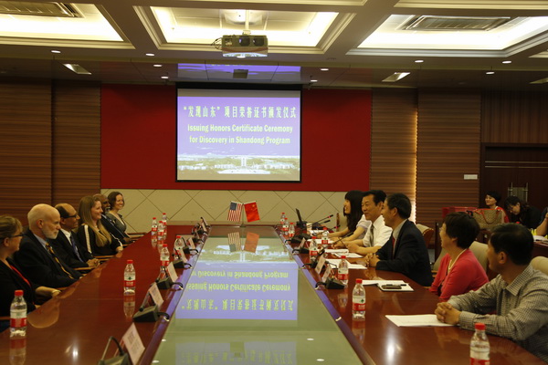 6月4日,美国莫瑞州立大学“发现山东”项目荣誉证书颁发仪式在三楼会议室举行,校党委副书记张铭锦分别为莫瑞州立大学代表团成员颁发了证书,标志着莫瑞州立大学代表团来校历时两个星期的“发现山东”对口交流活动画上了完美的句号。仪式由副校长原永兵主持。