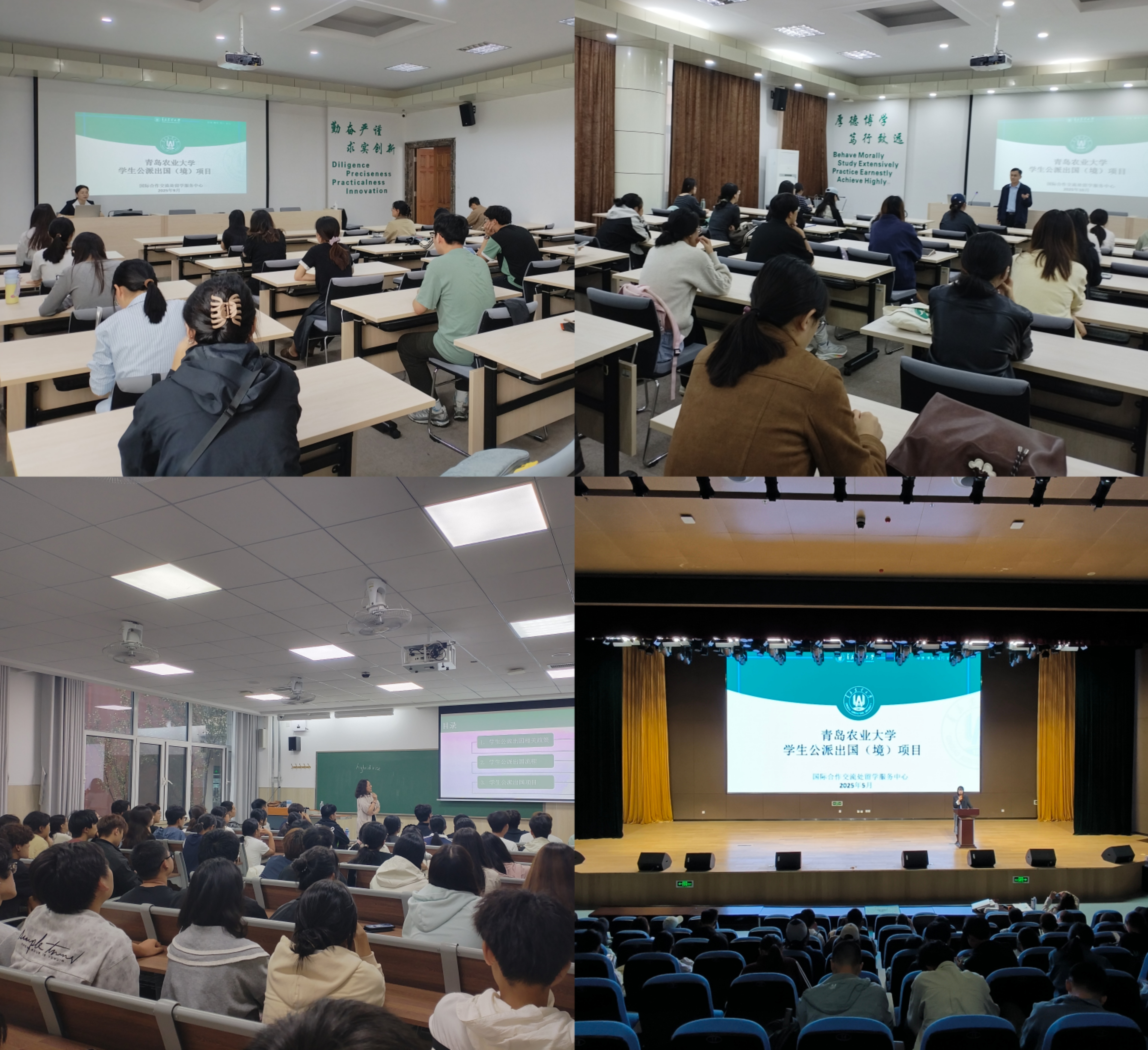 2025年春季、秋季学期伊始,为帮助学生深入了解学校公派学生出国(境)项目及相关政策,助力青农学子“筑梦全球”,学校在城阳、平度校区开展了为期9周,线上、线下共计50余场次的学生公派出国(境)项目宣讲会,吸引了近万名在校学生参与。同时,为助力毕业年级推免生在学术、职业和个人成长上实现突破,学校积极开展毕业年级推免生公派出国(境)项目专场宣讲会,旨在为学生提供国际化的学习平台,为全面提升学生的国际化学术视野奠定基础。