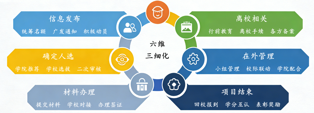 学校以“六维-三细化”体系为核心,实现从“粗放管理”到“精准服务”的转型。闭环体系的运作模式覆盖了信息发布、确定人选、材料办理、离校相关、在外管理、项目结束全流程;创新“海外小组长”学生自治模式,优化材料清单,提升服务效能。